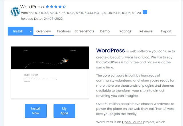 Kamu akan di arahkan ke halaman WordPress saat kamu pilih dashboad Softaculous. Disni kamu bisa melihat fitur wordpress, screenshots, review dan lain-lain. Untuk versi WordPress yang ada pada Softaculous itu merupakan versi yang terbaru, namun jika kamu ingin meyesuaikan versi yang lain kamu bisa memilihnya. Selanjutnya silahkan kamu pilih dan Install Now untuk melakukan proses instalasi WordPress.